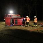 Zunächst wurden in Alt Stahnsdorf die Leistungsspange in Silber abgenommen: Dabei mussten die Löschgruppen wie bei einem richtigen Unfall handeln: Am fiktiven Einsatzort fanden sie ein auf der Seite liegendes Auto mit einer Person im Fahrzeuginneren vor. Nach einer ersten Lageerkundung durch den Gruppenführer ging es an die Betreuung des Patienten durch den Melder, während die drei Trupps nach dem Kommando des Gruppenführers die Bergung vorbereiteten. Zunächst wurde das Fahrzeug abgesichert, um schließlich mit schwerem technischen Gerät wie Schere oder Spreizer einen Zugang zum Fahrzeuginneren zu erhalten. Mit Einbruch der Dunkelheit stellten sich dann Einsatzkräfte der Abnahme der Leistungsspange Gold – mussten zunächst die Einsatzstelle ausleuchten, um dann zwei Personen aus ihrer Lage zu befreien. Praktisches Wissen wurde in einem weiteren Prüfungsteil beim Thema Erste Hilfe verlangt. Abgerundet wurde die Abnahme der Leistungsspangen durch einen Theorietest.